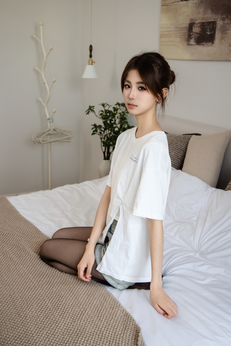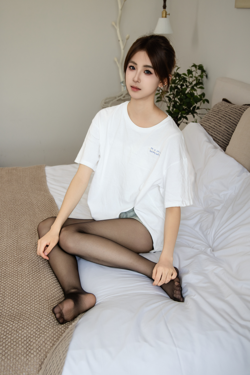 足愉心摄影第71期:模特小瑶(搭配:白色体恤、牛仔短裤、黑色丝袜、高跟鞋)