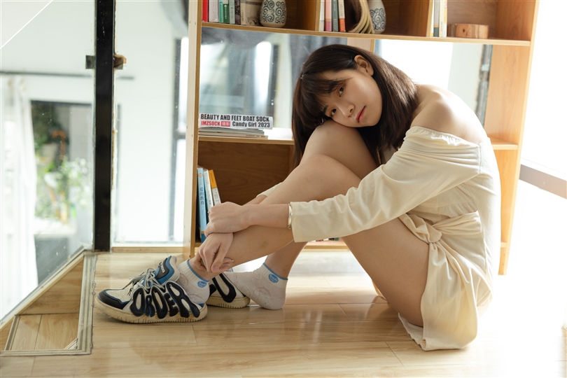 带有捆绑艺束的板鞋棉袜裸足